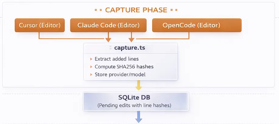 Cursor, Claude Code, and OpenCode expose hooks that fire when an agent edits a file. We intercept those events. Each tool gives slightly different raw data (strings vs patches vs full file snapshots), so we normalize them into the same internal representation: the set of newly added lines.