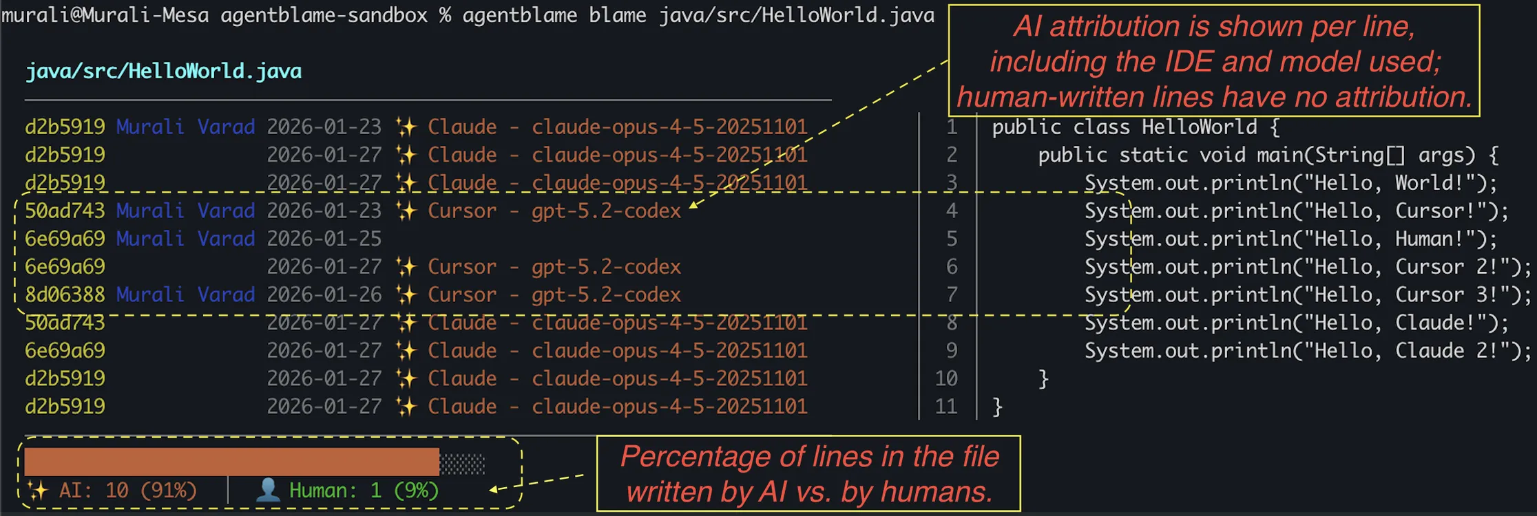 - In the screenshot, attribution appears next to each AI-written line, including the IDE and model used; human-written lines are unmarked.