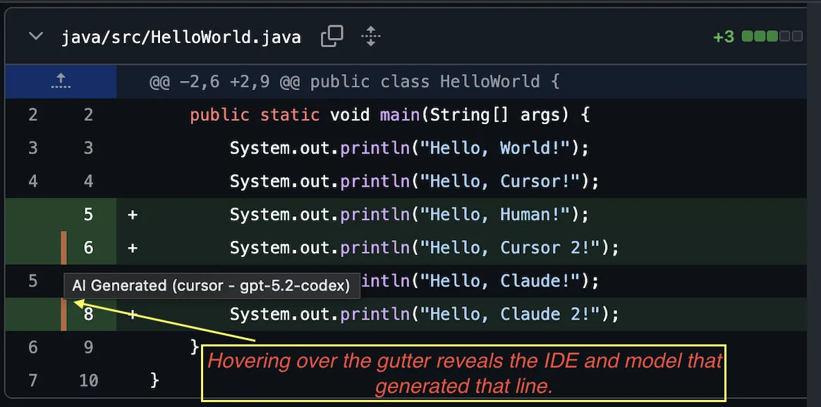 Inline markers in GitHub PR diffs. Hover shows provider, model, and confidence. Also shows a PR-level summary, including AI percentage.