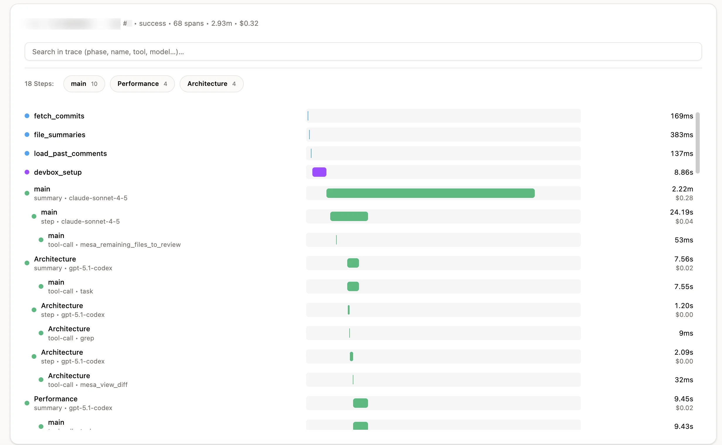 PREPARE,DEVBOX_SETUP,FILTER,FINALIZE). - Spans also cover agent execution (main agent and subagents).