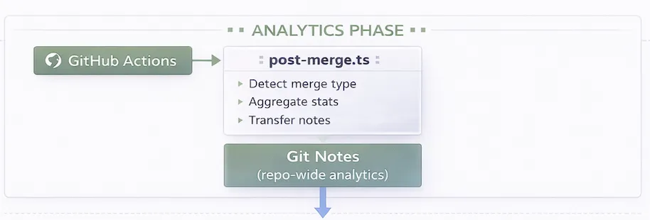 A GitHub Actions workflow runs on merge. It addresses the practical problem that squash and rebase merges create new commit SHAs, which can otherwise orphan attribution.