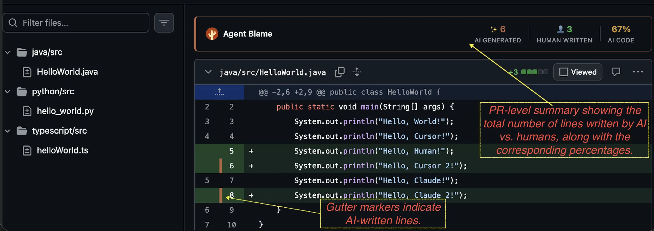 Inline markers in GitHub PR diffs. Hover shows provider, model, and confidence. Also shows a PR-level summary, including AI percentage.