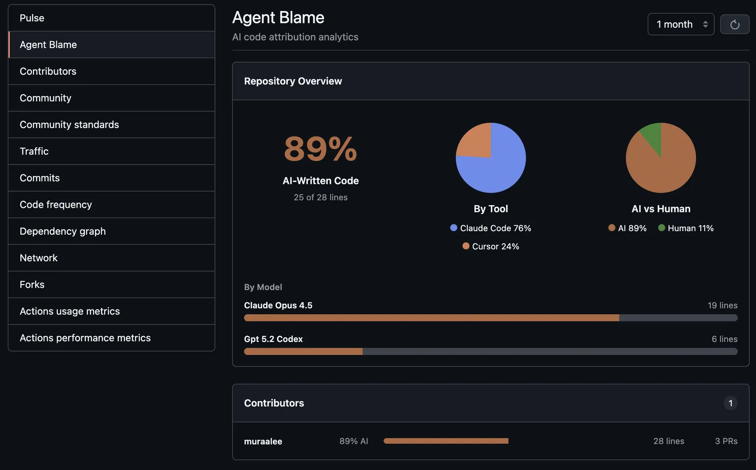 A repo-level view in GitHub Insights that tracks AI percentage and trends, broken down by tool, model, and contributor.